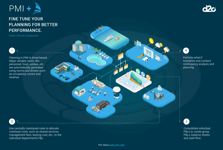 While PMI helps GMs and their teams optimize property P&Ls by managing daily resourcing more effectively, PMI+ assists the head office in maintaining control over the entire portfolio through streamlining group consolidation, scenario planning, and financial reporting. This includes providing comprehensive financial statements for individual properties as well as the group as a whole.