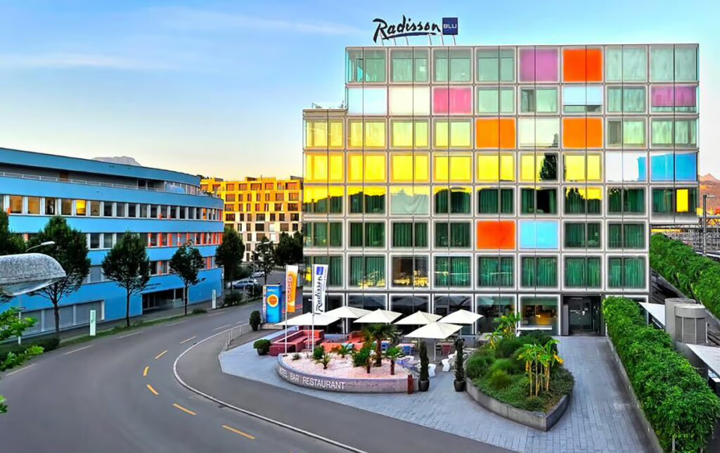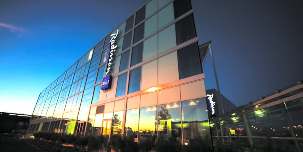 PMI at Radisson Blu Hotel Glasgow A dramatic curved copper screen is the dominant design element of the award-winning Radisson Blu Hotel Glasgow. The building is