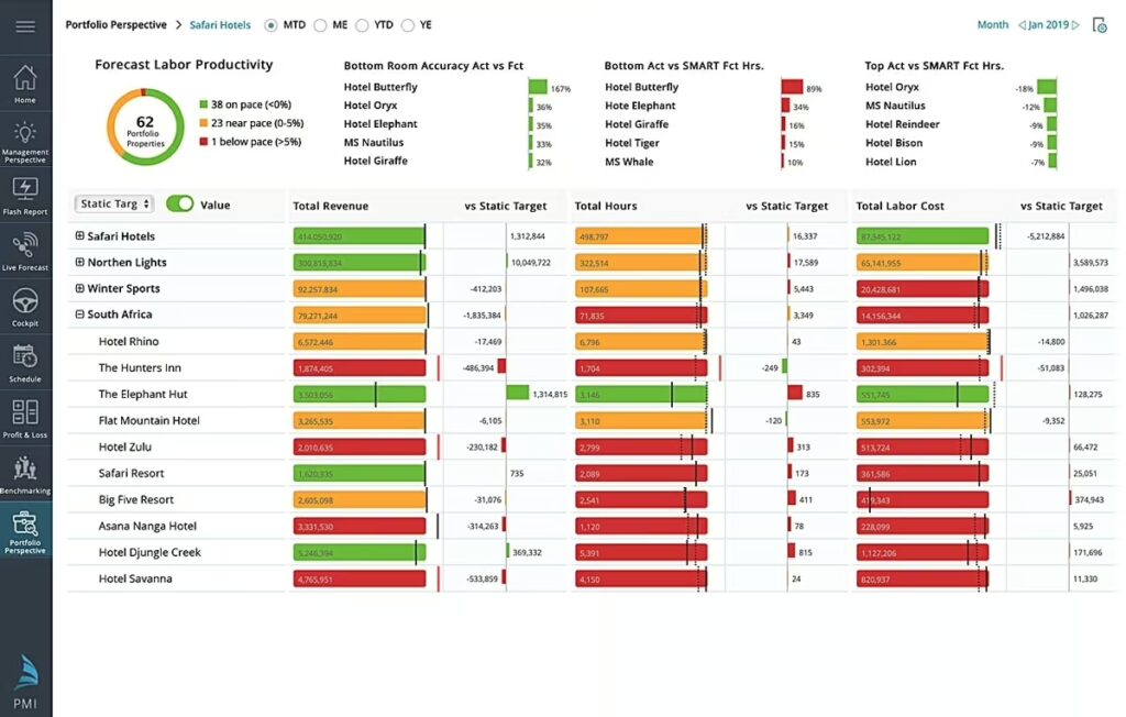 Portfolio Perspective displays information that matters to top-line conversion. It is an overview of the full portfolio and it is looking at Room Revenue, Hours